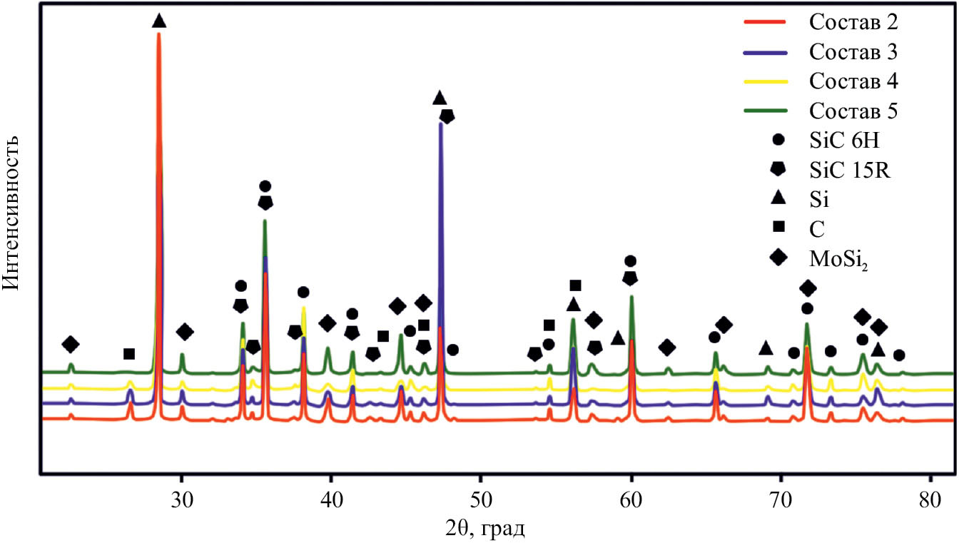 Соединения молибдена, в частности дисилицид молибдена, часто применяется в связке с карбидом кремния для получения композита с более высоким уровнем жаропрочности [10–15]. В качестве примера, композит SiC–MoSi2 был получен в работе [16] из механической смеси порошков Mo, Si и С. В ходе постепенного нагрева компактированных образцов, при 1100°C определили фазы Mo и Si, вместе с небольшим содержанием Mo3Si и Mo5Si3. При 1300°C основными зафиксированными фазами были SiC–MoSi2, затем образцы спекали при 1550°C. Предел прочности при изгибе полученных образцов составил 275 МПа.