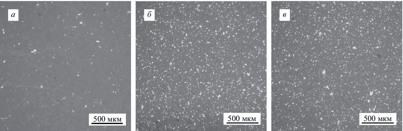 Рис. 5. Увеличение содержания фазы MoSi2 при введении молибдена в реакционно-спеченном керамическом материале: а – состав 2; б – состав 4; в – состав 5