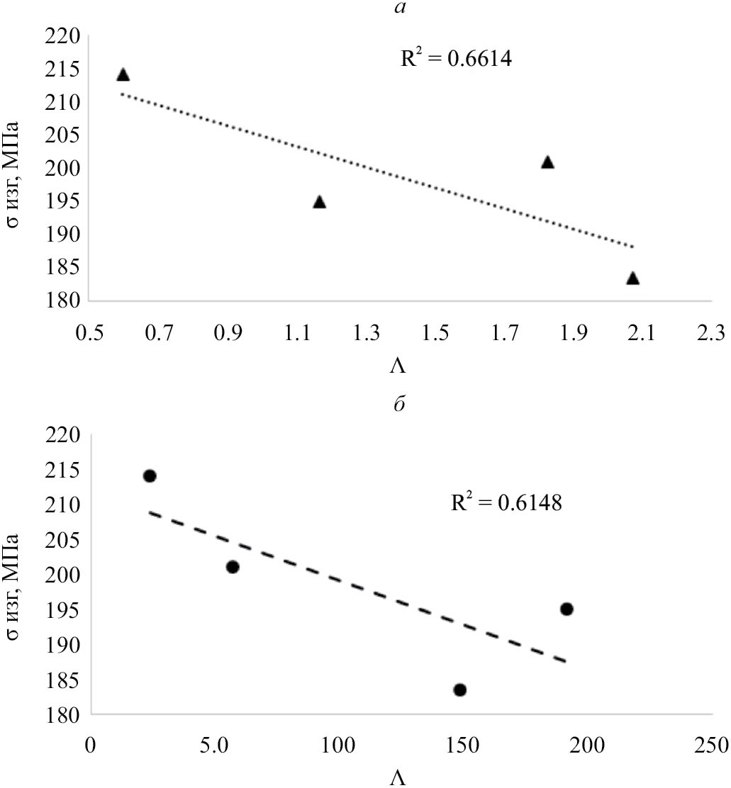Рис. 7. Взаимосвязь структурных и прочностных характеристик керамик: а – зависимость прочности на изгиб от лакунарности по зернам всех типов; б – зависимость прочности на изгиб от лакунарности по зернам дисилицида молибдена