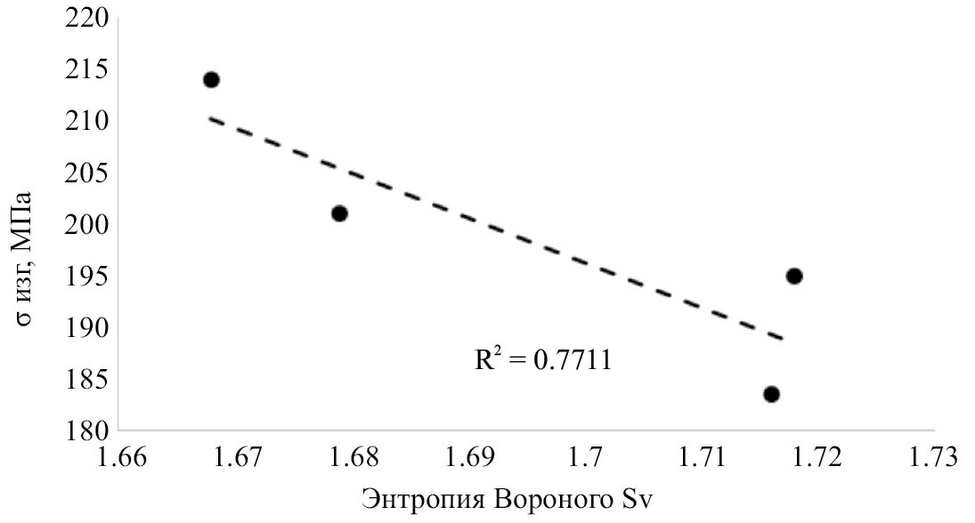Сопоставление расчетной характеристики хаотичности структуры материалов, выраженной параметром энтропии Вороного по зернам дисилицида молибдена, с изгибной прочностью представлено на рис. 8.