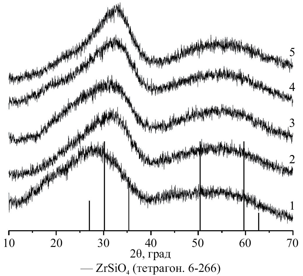 На рентгеновских дифрактограммах образцов состава (1–x)ZrSiO4xHfO2 после обжига при 1000°C наблюдаются как рефлексы циркона (рис. 5, дифрактограмма 1–4), так и более заметные рефлексы HfO2 (рис. 5, дифрактограммы 2–4).