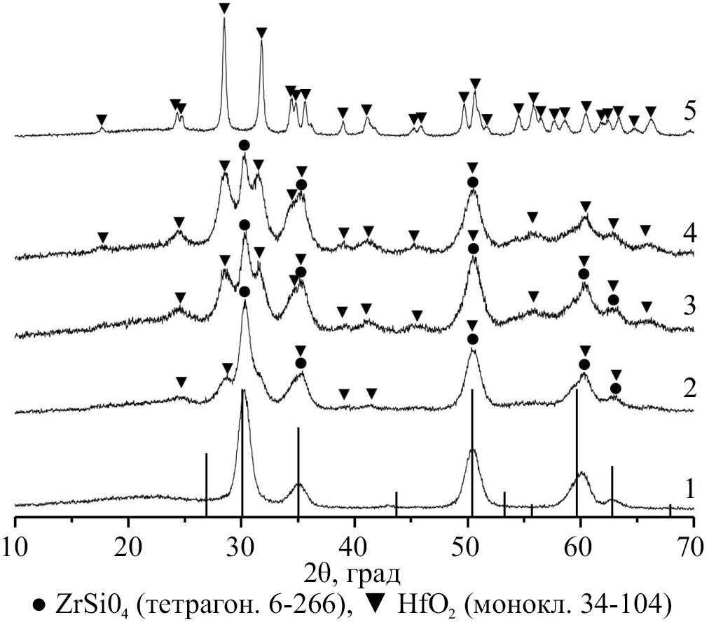Рентгеновские дифрактограммы, представленные на рис. 4, подтверждают образование соответствующих композиций (1–x)ZrSiO4xHfO2, при этом заметно стимулирующее влияние оксида гафния, как и в случае оксида циркония [7], на кристаллизацию циркона в смеси компонентов – рефлексы, отвечающие циркону, становятся более узкими и интенсивными (рис. 4, дифрактограммы 24). Это подтверждается и снижением температуры начала кристаллизации циркона в композициях (рис. 3).