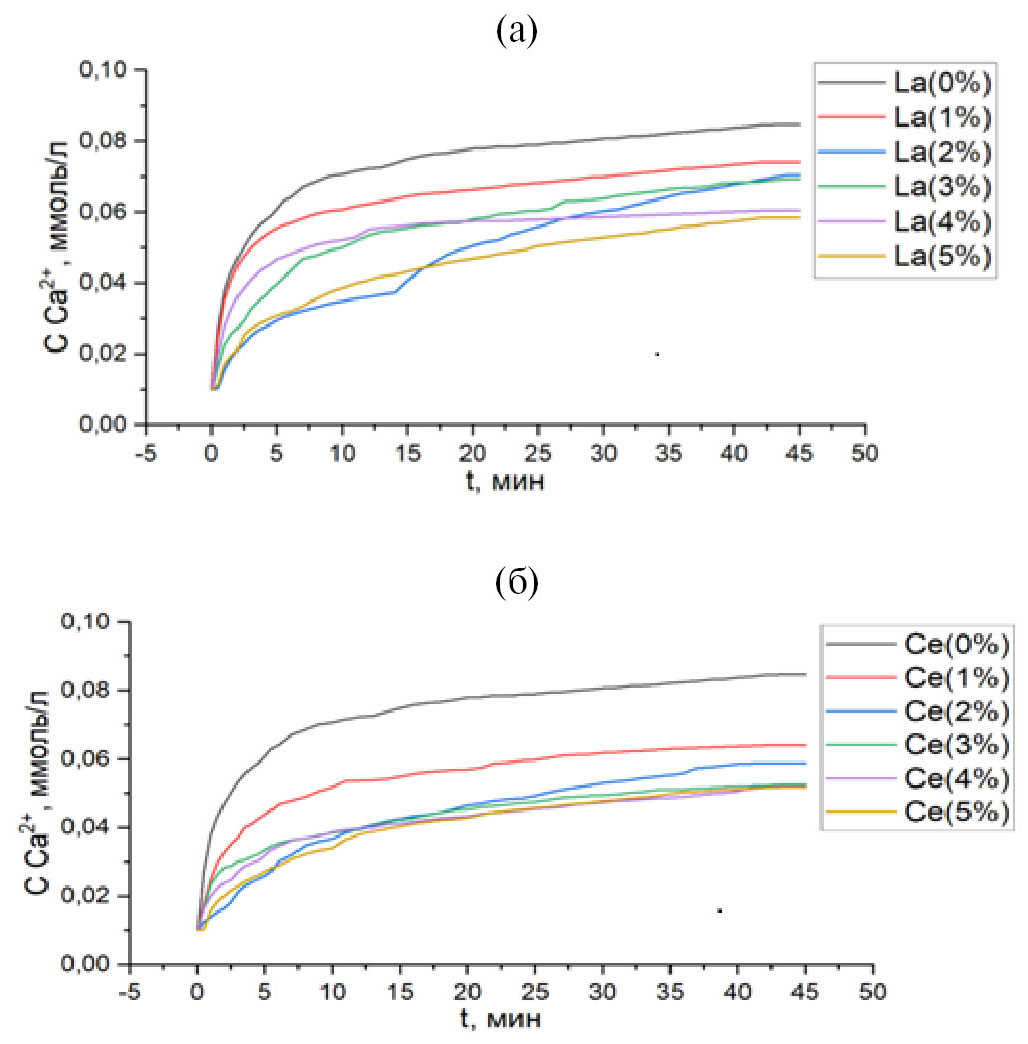 При исследовании растворимости синтезированных образцов в соляной кислоте (рН = 2.0), которая моделирует активную резорбцию, наблюдаются различные зависимости. Насыщение ионами кальция раствора происходит на 10 минуте. Так, образцы гидроксиапатита, допированные ионами La3+, растворяются с меньшей скоростью по сравнению с ГА без добавки РЗЭ (рис. 5(а)), а образцы ГА с добавлением 1, 2, 3% Ce3+ обладают большей скоростью растворения по сравнению с гидроксиапатитом без добавок. Исходя из этого, присутствие ионов Ce3+ в структуре ГА может способствовать резорбции материала.