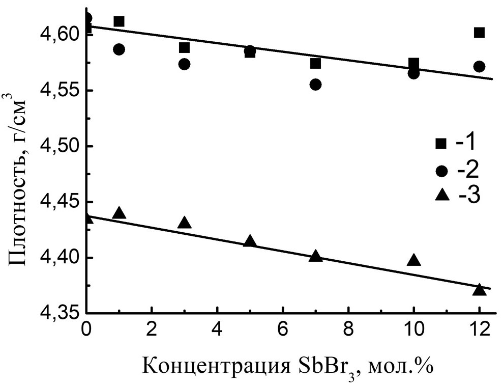 Рис. 1. Зависимость плотности стекол системы As-Se-SbBr3 от содержания бромида сурьмы. 1 – (As40Se60)100-x(SbBr3)x – закалка от 500 °С; 2 – (As40Se60)100-x(SbBr3)x – закалка от 450 °С; 3 – (As20Se80)100-x(SbBr3)x – закалка от 450 °С.