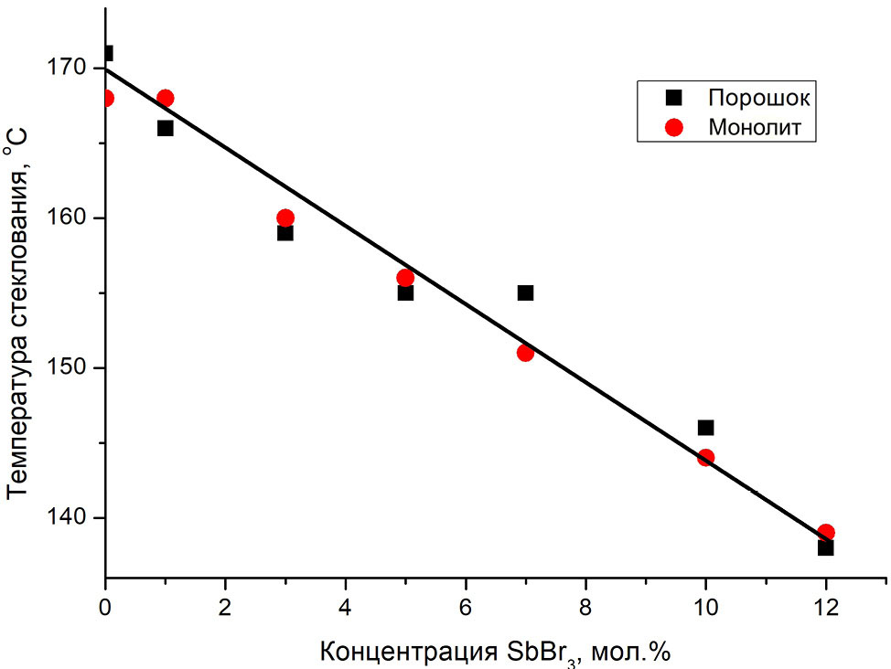 Значения температуры стеклования порошкообразных и литых образцов практически одинаковы. На рис. 4 видна тенденция к понижению температуры стеклования (Tg) от 168 до 139 °С с ростом содержания в стеклах бромида сурьмы. В то же время при введении в стекло As36Se64 только сурьмы в количестве до 6 мол. %. Температура стеклования не меняется и остается в среднем равной 143 °С.