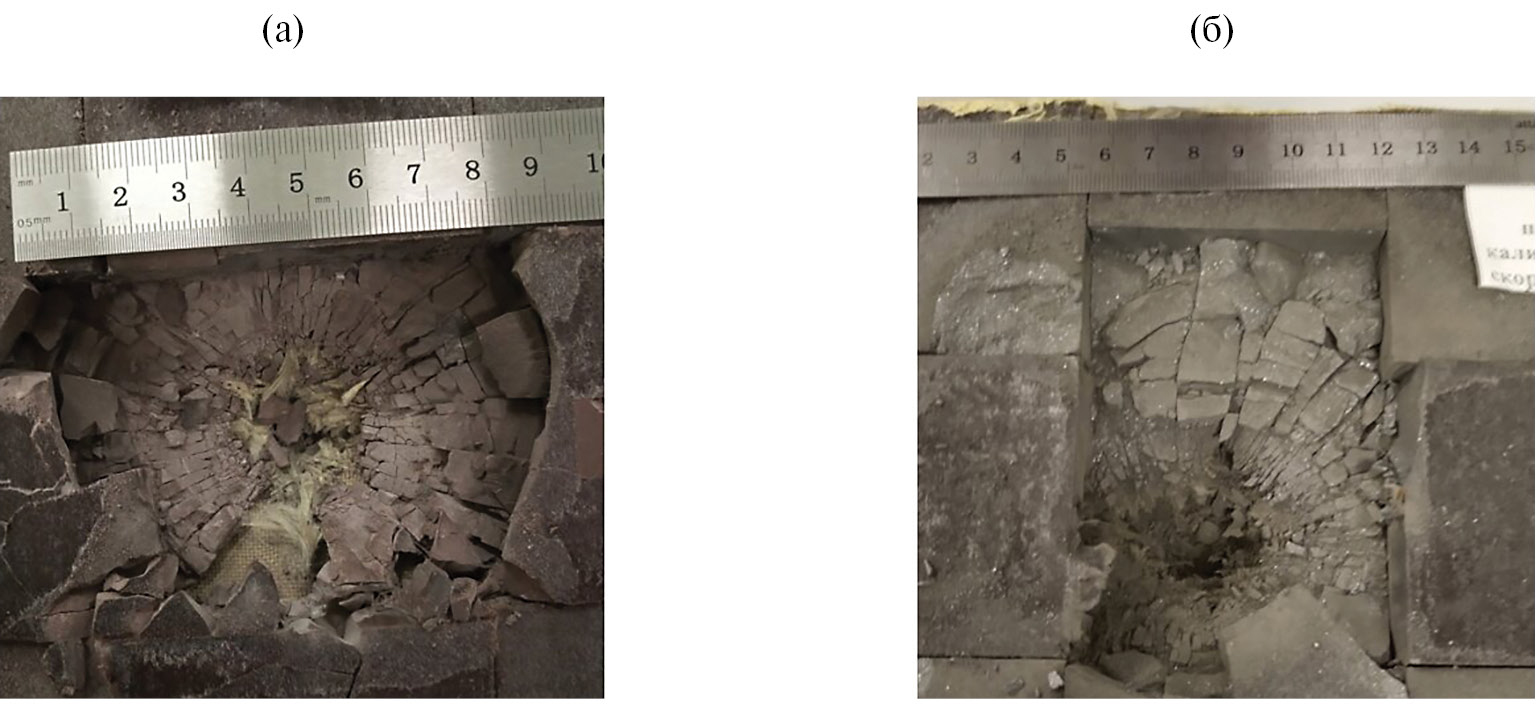 Рис. 2. Фотографии панелей на основе керамики после воздействия индентора: а – корунд, б – керамика “Идеал”.
