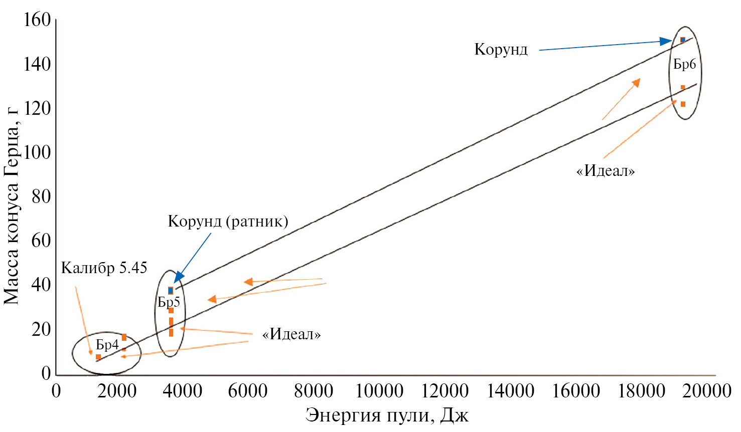 Рис. 3. Зависимость массы сформировавшегося конуса Герца от энергии индентора. Синие точки относятся к панелям на основе корунда, оранжевые – к панелям на основе керамики «Идеал».