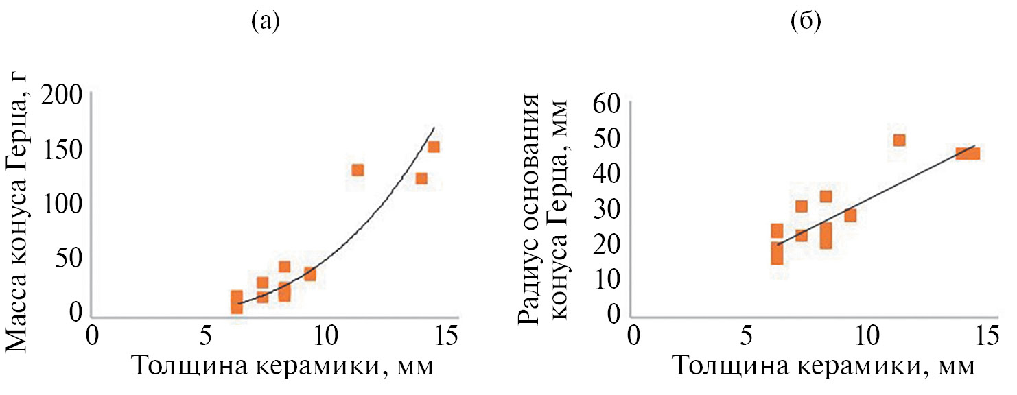 Параметры конуса Герца (размер основания конуса, объем и масса) зависят от толщины керамической пластины, это связано с количеством выбиваемого индентором материала (см. рис. 4).