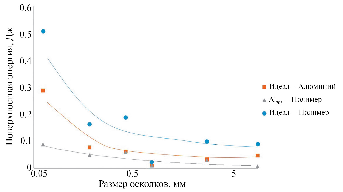 Необходимо отметить, что условия проведения эксперимента не позволяют собрать абсолютно все осколки, поэтому точно оценить энергию, затраченную на образование новых поверхностей достаточно сложно. Однако результаты эксперимента позволяют оценить разницу в баллистических свойствах исследуемых материалов. Суммарная поверхностная энергия мелких осколков различных фракций фракциям представлена на рис. 5. Наибольший вклад в формирование новой поверхности вносят наиболее мелкие осколки, а их количество максимально.