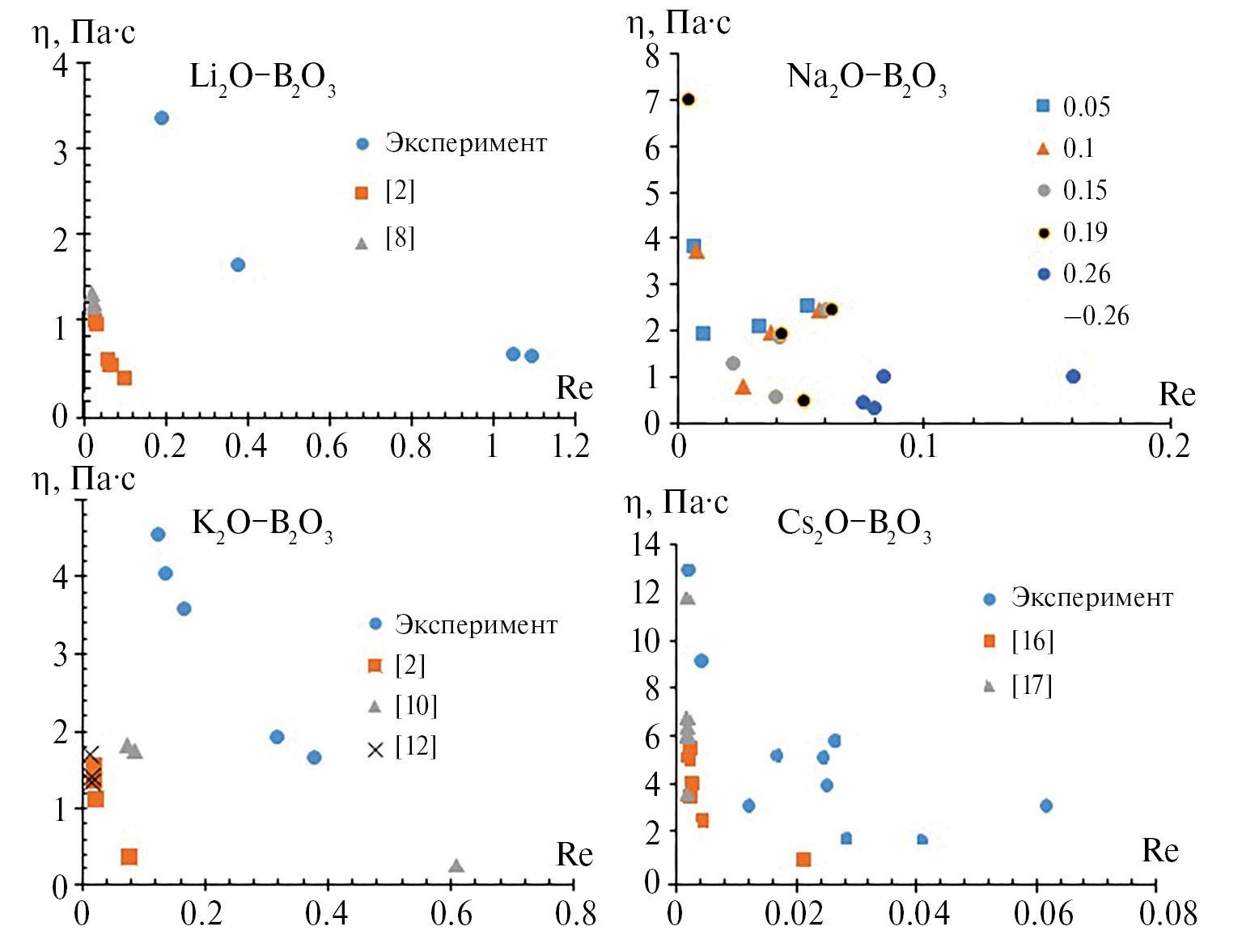Рис. 1. Корреляция вязкости расплавов Me2O–B2O3 (Me = Li, Na, K, Cs) с числами Re.