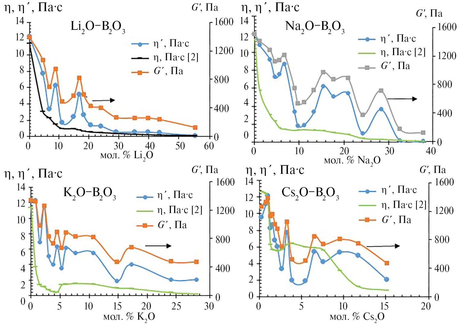 Необходимо отметить, что в расплавах KB → CsB наблюдается снижение η' и G' в области ~10 мол. % Me2O (рис. 2) Из данных КР-спектроскопии [29] известно, что при этих составах в расплаве CsB появляются немостиковые кислороды, которые снижают связность сетки расплавов. Это приводит к снижению вязкоупругих параметров расплава CsB по отношению к KB. В расплаве NaB немостиковый кислород в заметных количествах появляется при концентрации ~20 мол. % Me2O. Поэтому снижения параметров η' и G' в приведенном концентрационном интервале (0–20 мол. %) у расплавов LiB и NaB не наблюдается.