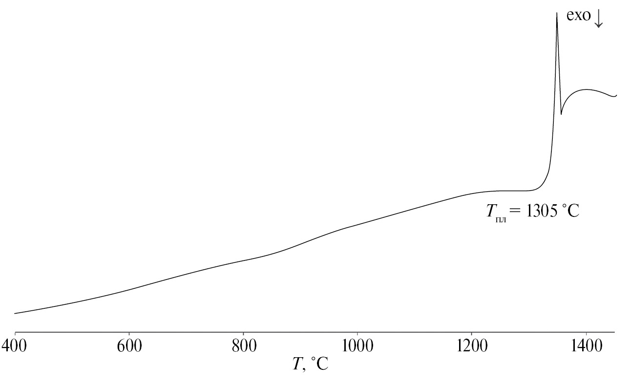 На кривой ДСК начало эндотермического эффекта, соответствующего температуре плавления Sm14(GeO4)2(BO3)6O8, было определено при температуре при 1305 °C по изменению первой производной кривой ДСК (рис. 1). Никаких других эффектов на кривой ДСК не наблюдалось. Согласно данным термогравиметрии (ТГ), потеря массы практически не наблюдалась.