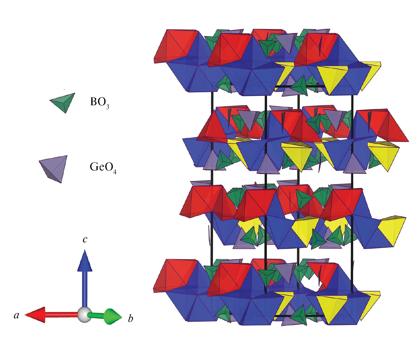 Атомы бора (шесть независимых позиций) координированы тремя атомами кислорода, формируя треугольные радикалы BO3 со средними длинами связей: B(1) – 1.36–1.41, B(2) – 1.31–1.42, B(3) – 1.34–1.44, B(4) – 1.36–1.40, B(5) – 1.31–1.38 Å. Треугольный радикал B(6)O3 статистически разупорядочен, для него локализовано 5 атомов кислорода с длинами связей 1.16–1.54 Å. Позиции O(25)–O(28) частично заселены на 50%. Атомы Ge имеют две независимые позиции, они координированы четырьмя атомами кислорода, образуя практически правильные тетраэдры, с длинами связей Ge(1) 1.70–1.74 и Ge(2) 1.74–1.76 Å.