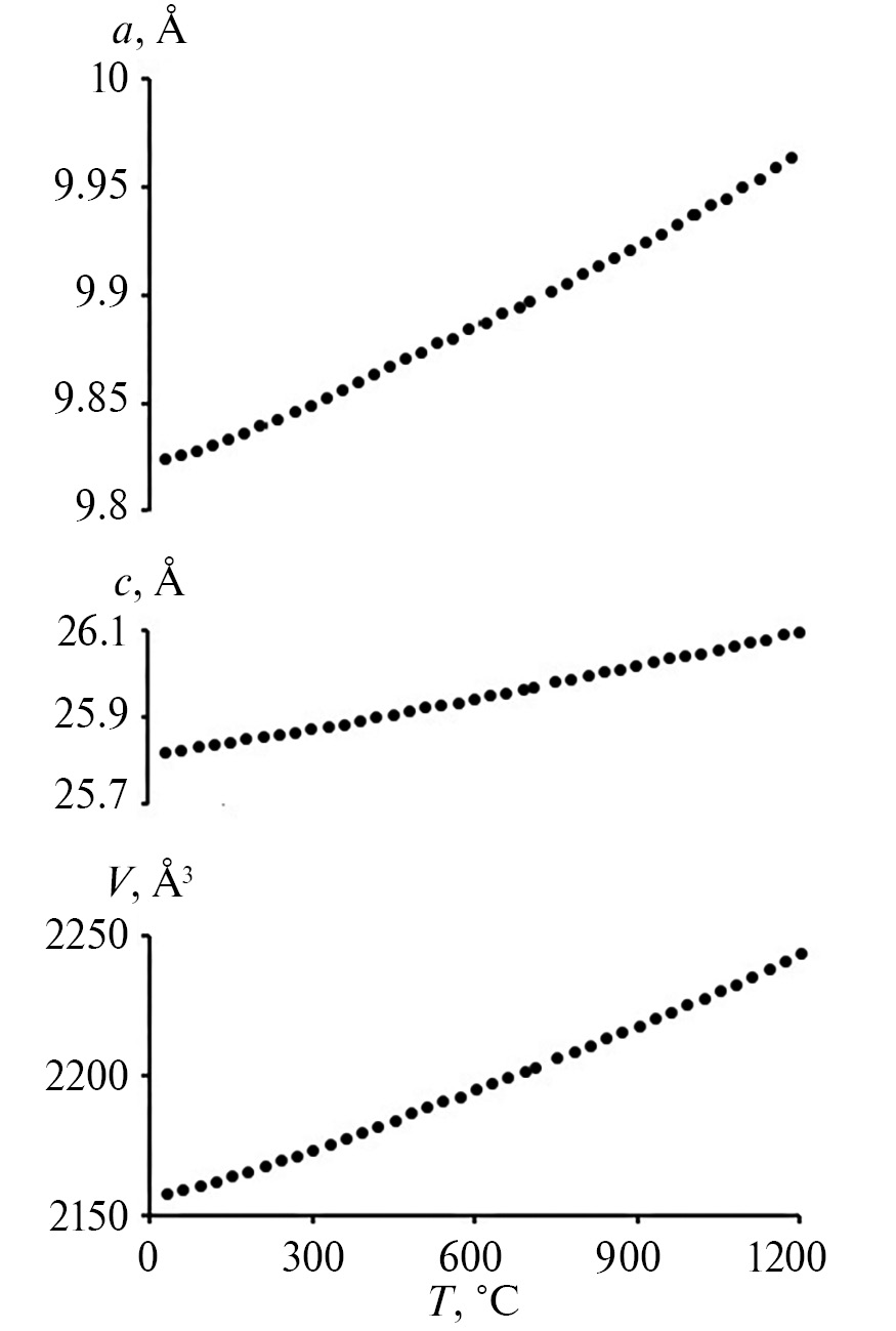 С повышением температуры дифракционная картина соединения не претерпевала изменений. Пики закономерно смещались в область малых углов, фазовый состав образца не менялся. Температурные зависимости параметров и объема элементарной ячейки аппроксимировали полиномами второй степени в интервале температур 30–1200 °С (рис. 5, табл. 1).