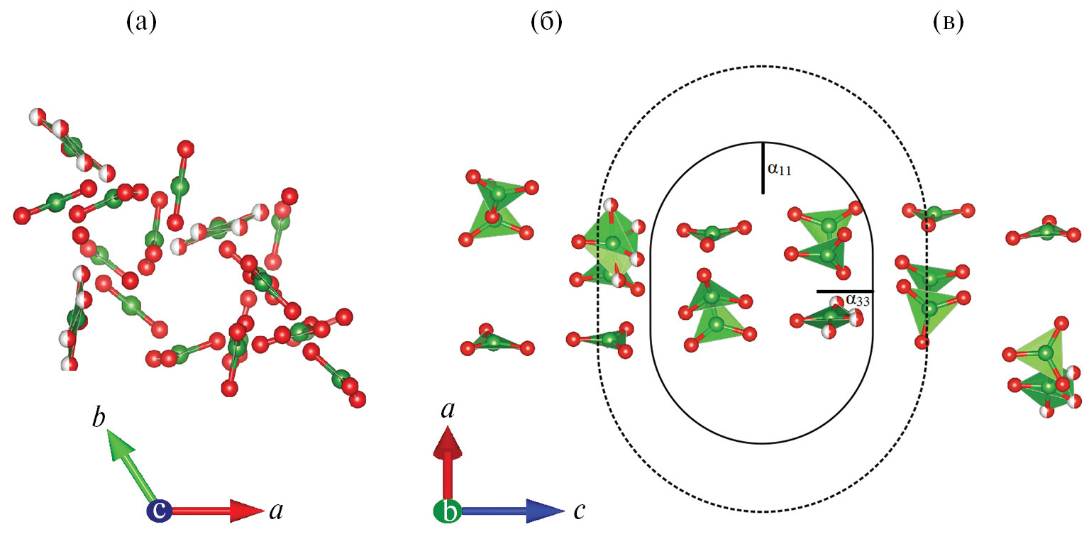 Максимальное термическое расширение происходит в плоскости ab, минимальное – вдоль оси c, поскольку в этом направлении расположены плоскости изолированных треугольных радикалов BO3 (рис. 6). Такой характер термического расширения хорошо согласуется с принципами высокотемпературной кристаллохимии боратов [16, 17].