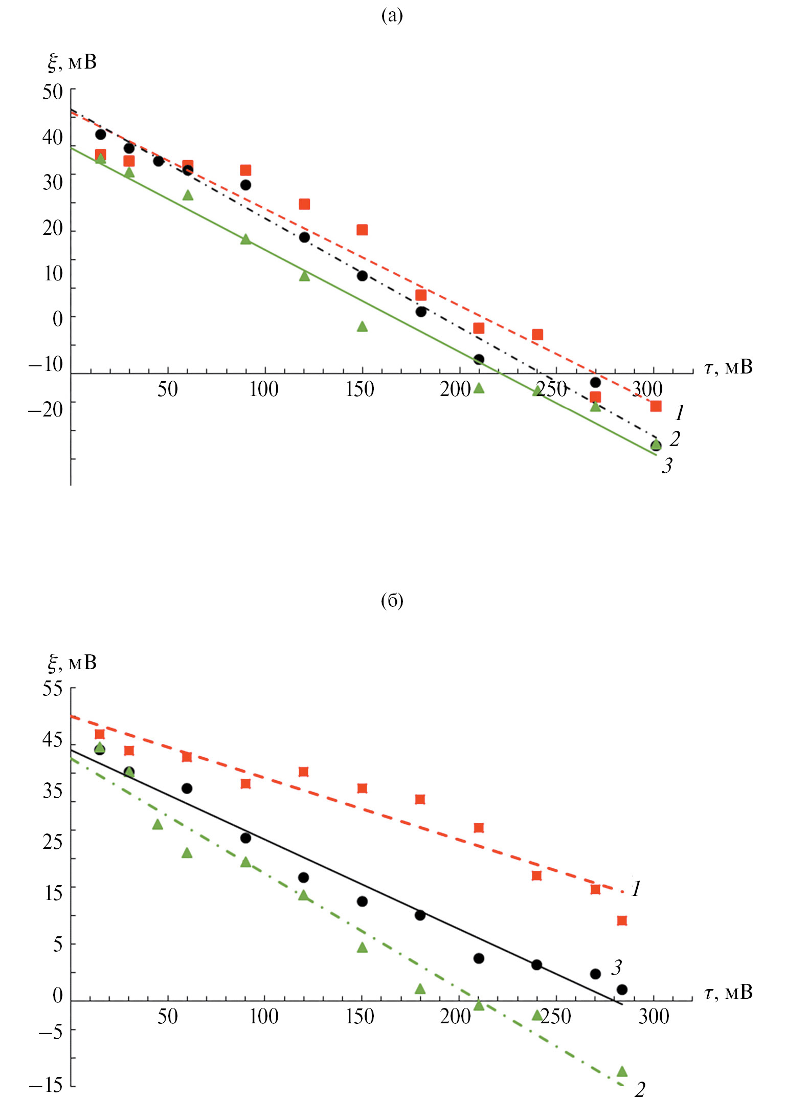 Рис. 2. Зависимость ζ-потенциала раствора с частицами прекурсоров алюмоциркониевых оксидных систем с РЗЭ от времени: 1 – Al2O3–ZrO2–Nd2O3, 2 – Al2O3–ZrO2–La2O3, 3 – Al2O3–ZrO2–Dy2O3, при содержании РЗЭ в растворе, 5 (а) и 10 мас. % (б).