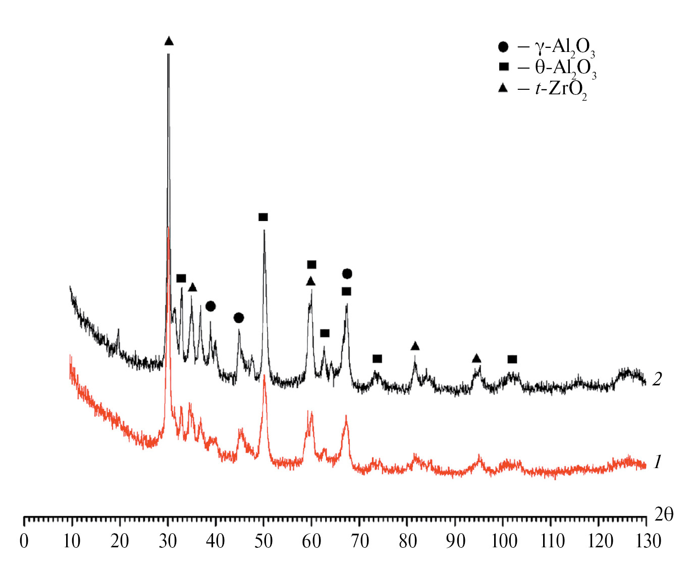 Обнаружено, что рентгеновские дифрактограммы образцов, прокаленных при 1100 °С, характеризуются уширенными пиками, описывающими оксиды разных кристаллических структур алюминия (θ-Al2O3, γ -Al2O3) и циркония (t-ZrO2) (рис. 4).