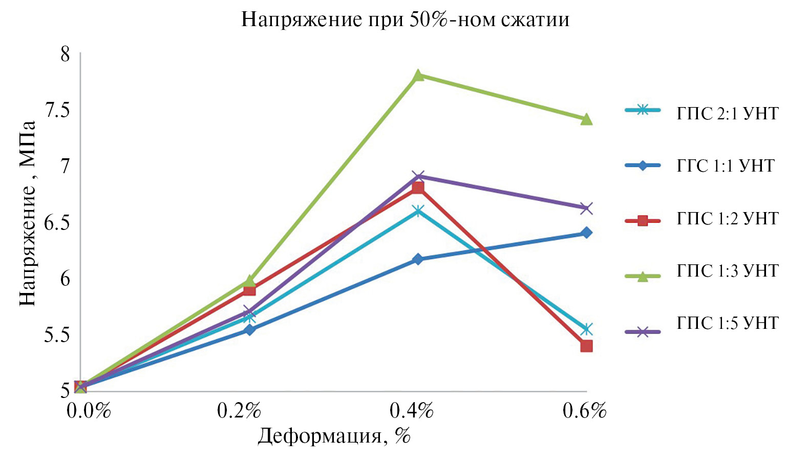 Из рис. 7 и 8 видно, что наилучший результат достигается при соотношении графена и УНТ 1 : 3 соответственно и концентрации нанонаполнителя 0.4 мас. %, что обеспечивает существенное повышение прочностных характеристик: прочность при разрыве увеличилось на 35%, напряжение при 50% деформации сжатия увеличилось на 50%.
