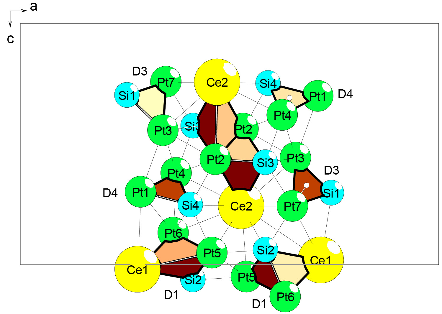 Рис. 1. Ce4Pt14Si8-oP52. Гептамер в виде димера K4+K4, связанного c пентамером 2K3+1K6 +2K3.