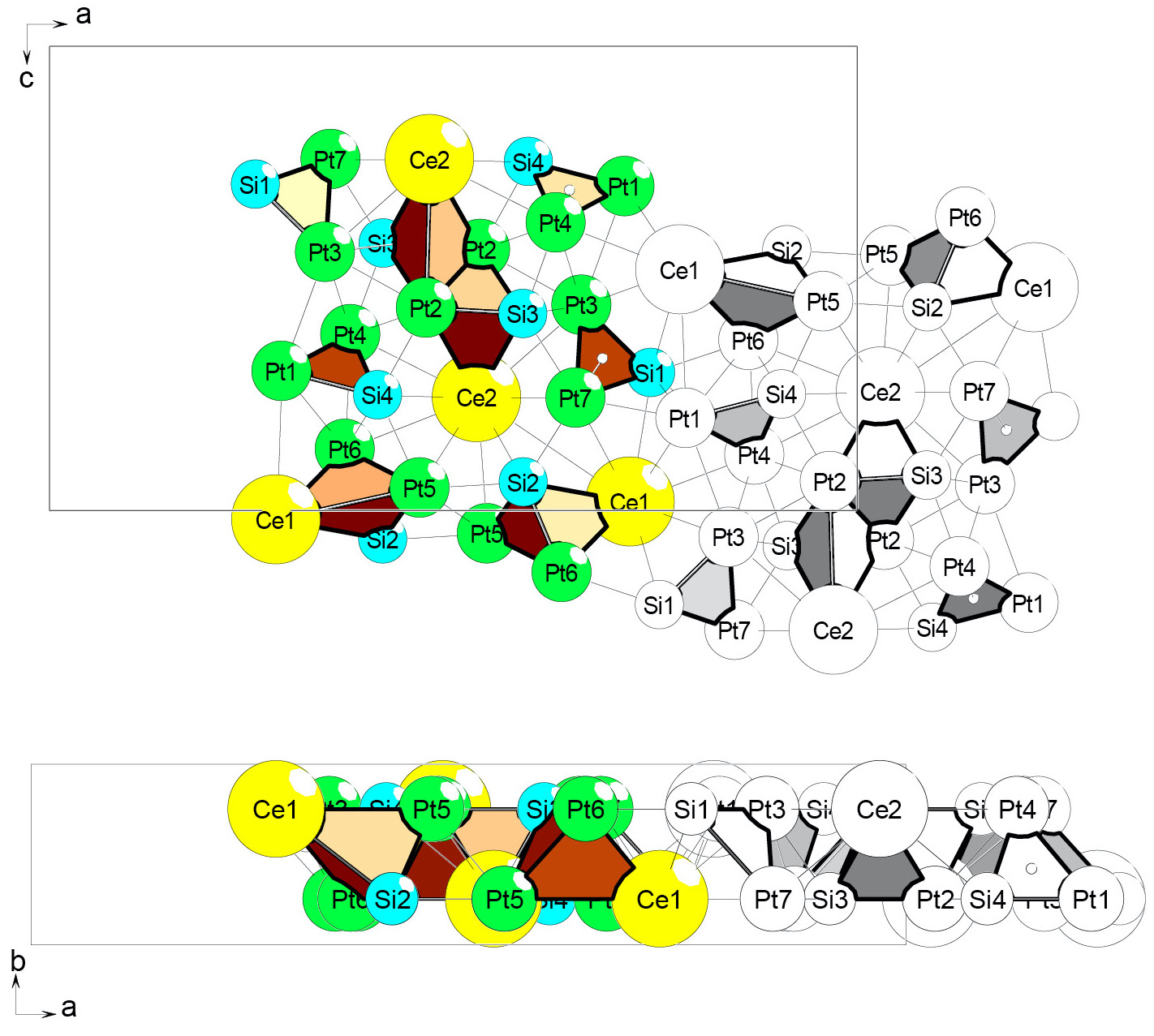 Рис. 2. Ce4Pt14Si8-oP52. Слой из двух связанных гептамеров (2 проекции).