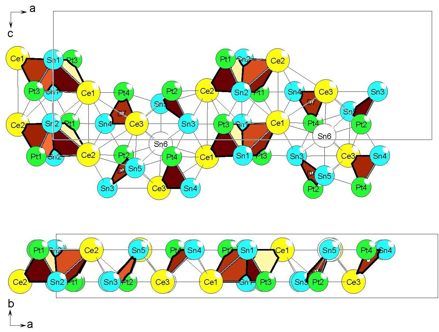 Кристаллическая структура Ce6Pd8Sn12-oP52 = (Ce2Pd2Sn2)4 (CePdSn)2 (PdSn2)2-oP52