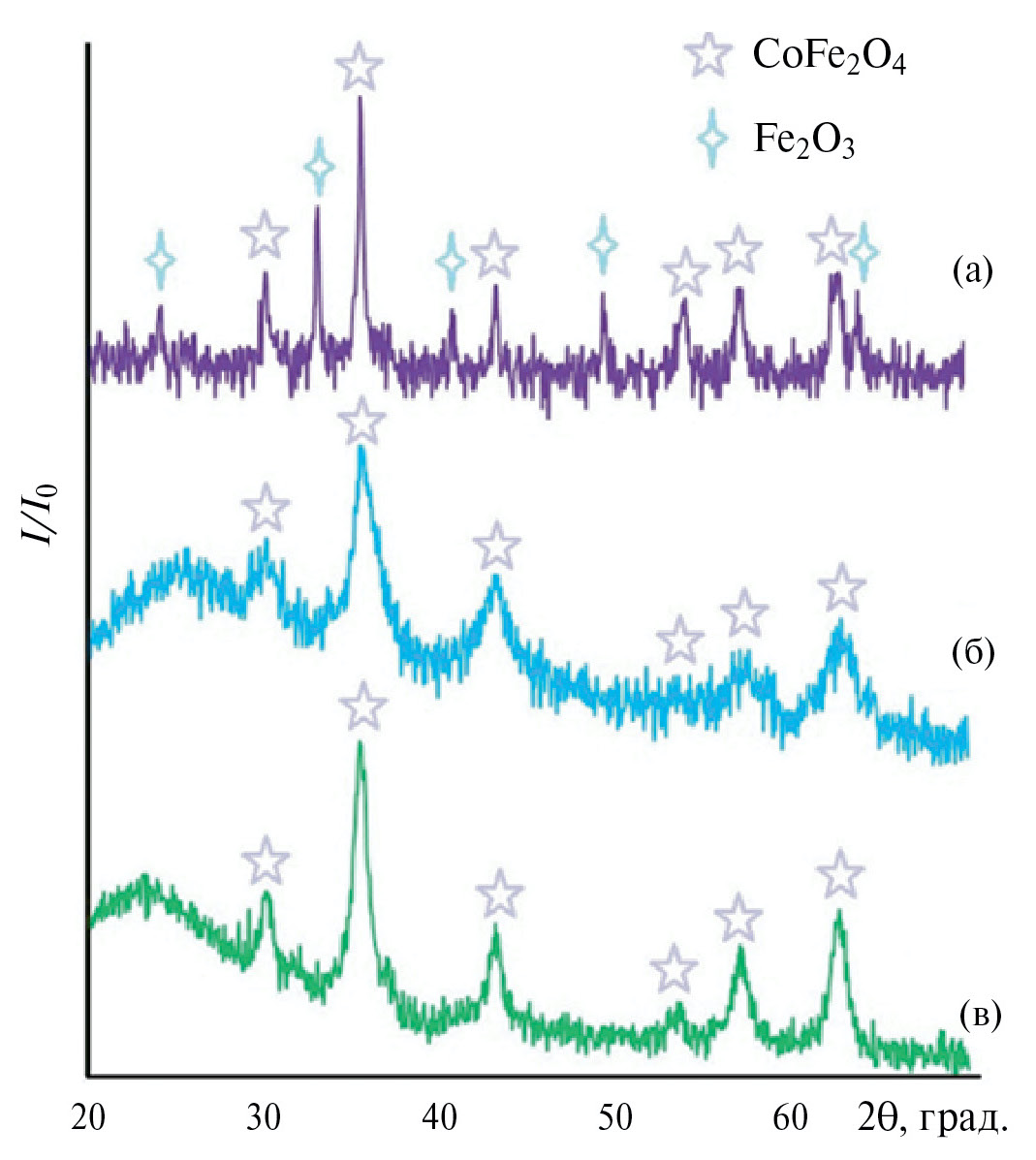 После термолиза во всех образцах на рентгенограмме (рис. 2) присутствуют линии, характеризующие фазу шпинели CoFe2O4 (PDF Number 010-74-6403). В образце 1 дополнительно присутствует оксид железа (III) (PDF Number: 010-76-8395). По результатам анализа рентгенограмм образцов рассчитанные значения параметров кристаллической решетки, обращенности, длин связей приведены в табл. 3. На рис. 1б, г, д приведены микрофотографии синтезированных материалов. Как видно из полученных результатов, феррит кобальта (II) имеет близкие значения структурных характеристик вне зависимости от того, является ли он отдельно полученным веществом или входит в состав композита: величины рентгеновской плотности, объема элементарной ячейки, межатомные расстояния различаются в пределах 1%. Это может быть связано с близкими условиями синтеза, что приводит к формированию однотипных соединений. Однако размер кристаллитов для феррита кобальта (II) в составе органо-неорганического композиционного материала меньше на 9–25% по сравнению с «чистым» CoFe2O4. Также значительно (в 2.8–3.4 раза) увеличивается удельная площадь поверхности композита по сравнению с индивидуальным веществом. Это может быть связано с влиянием морфологии биочаров.