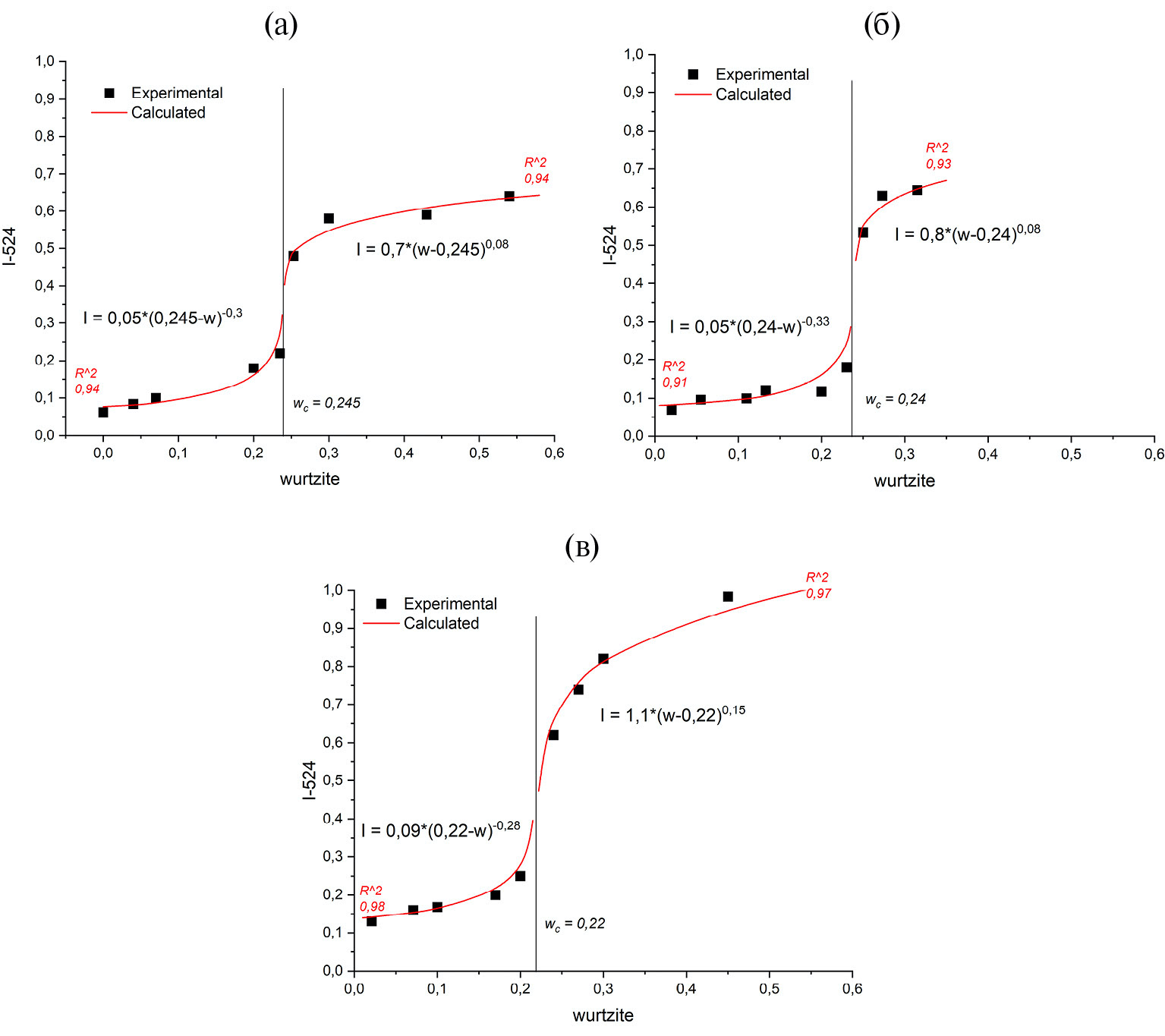 В таком случае уравнения (1) и (2) могут быть модифицированы следующим образом: σ принимает значения I – относительной интенсивности полосы с максимумом при 525 нм в спектре радиолюминесценции; может изменяться в пределах от 0 (данная спектральная полоса отсутствует) до 1 (полоса является единственной в спектре); σ бозначается как I1 и I2 – максимальное и минимальное значение интенсивности соответственно, которые определяются отдельно для верхней и нижней веток кривой (как доля вклада полосы в общий спектр РЛ); v принимается как w – доля содержания вюрцитной фазы в образце, может изменяться в пределах от 0 (чистый сфалерит) до 1 (чистый вюрцит); wC – значение содержания вюрцита в люминофоре, при котором происходит резкий рост интенсивности радиолюминесценции (порог перколяции); β – критический индекс, определяющийся параметрами кластера. Преобразованные уравнения, таким образом, могут быть представлены в виде: