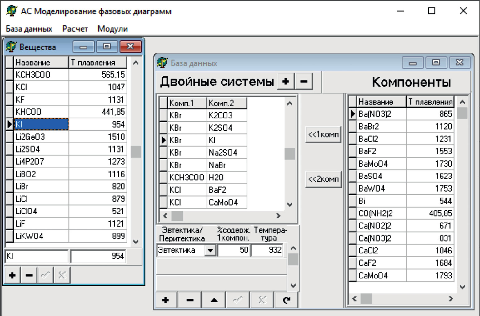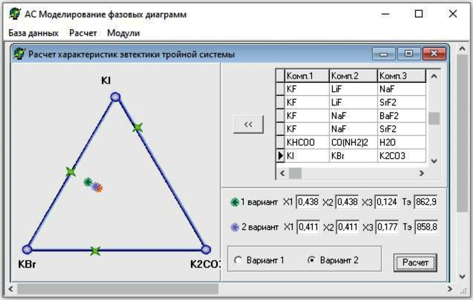 Следующим шагом был расчет составов точек неизвестных систем по методу Мартыновой – Сусарева [22]. Основан на термодинамических соотношениях, справедливых для тройных гетероазеотропных систем. Состав и температура тройной точки системы рассчитываются с использованием данных о бинарных системах, образующих данную систему. На основе метода был разработан алгоритм расчета состава и температуры эвтектического сплава тройных систем [23], который реализован программно в среде визуального программирования Delphi (рис. 1, 3).