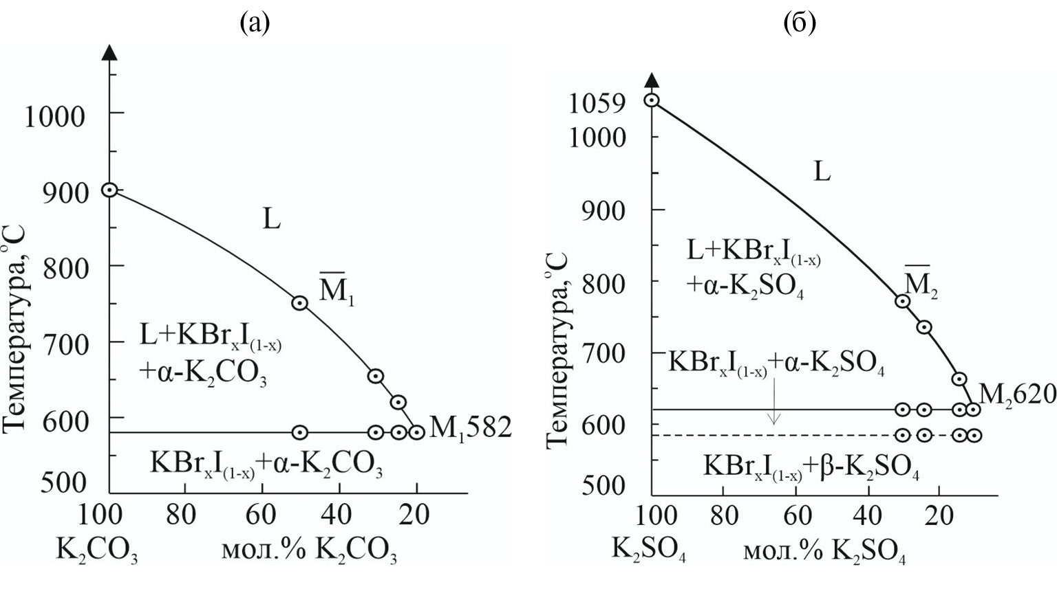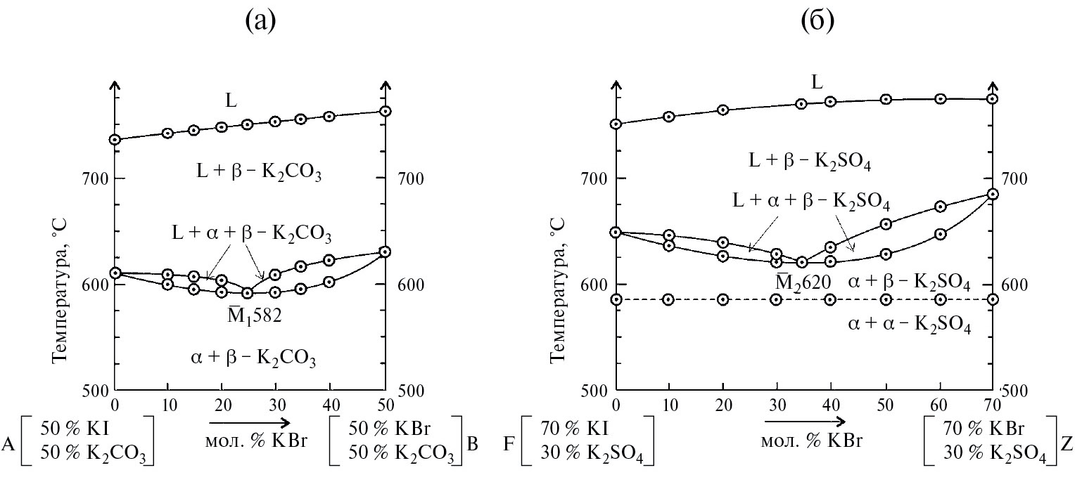 Рис. 5. Нонвариантные разрезы для трехкомпонентных систем KI-KBr-K2CO3 (а) и KI-KBr-K2SO4 (б).