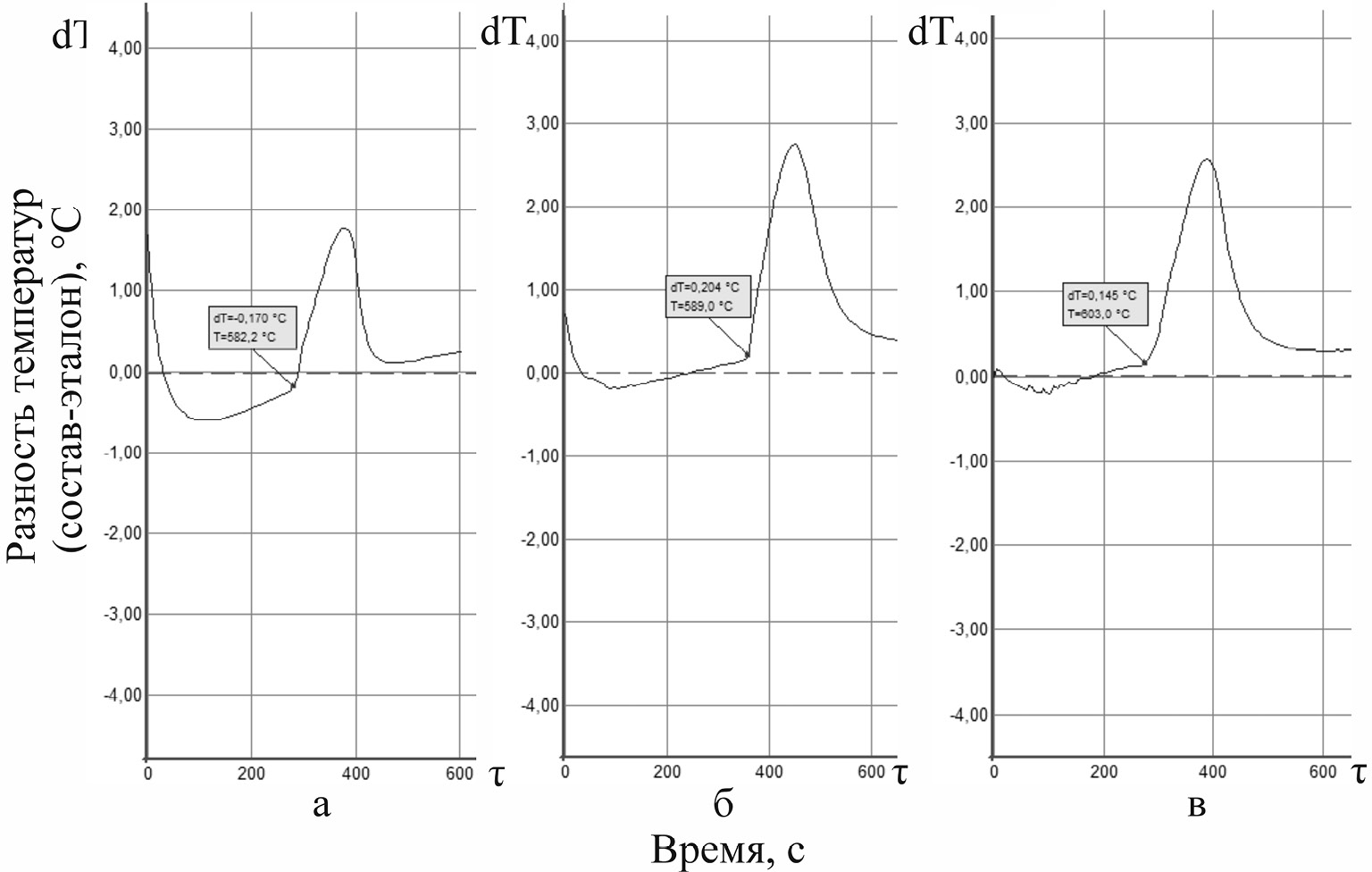 Рис. 10. Термограммы: а) точка М1 (KI-40.0%; KBr-40.0%; K2CO3-20.0%); б) точка х на линии М1-М2 (KI-38.2%; KBr-38.1%; K2CO3-21.7%; K2SO4-2.0%); в) точка у на линии М1-K2SO4 (KI-36.4%; KBr-36.4%; K2CO3-24.2%; K2SO4-3.0%).