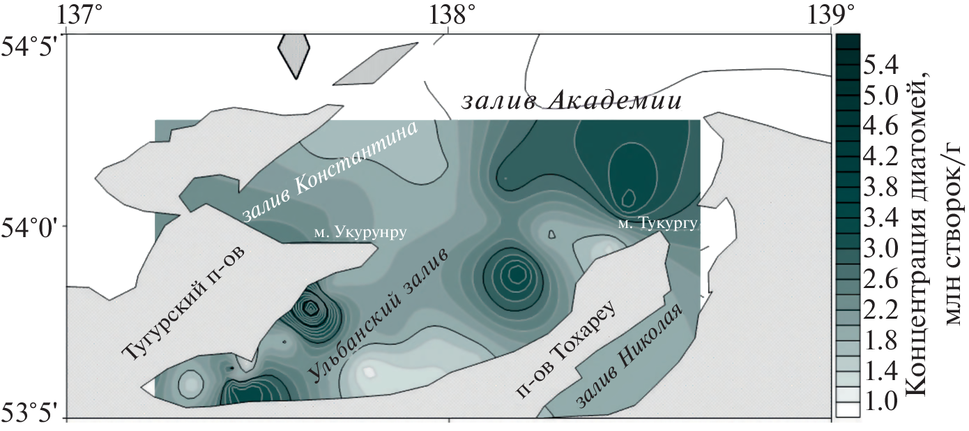 The study of diatoms in the surface sediments of the Academy Bay (Sea of Okhotsk) revealed a rich diatom flora (187 species and intraspecific taxa), represented mostly by marine and brackish water species. The predominance of benthic-planktonic and benthic species indicates a significant role of microphytobenthos in the Academy Bay. The diatom assemblages distinguished with the use of cluster analysis are homogeneous in their taxonomic composition, but differ in ecological structure, which is mainly determined by water salinity. The concentration of diatoms in the sediments in the open part of the Academy Bay and in the apex of the Ulban Bay depends on a high productivity of waters and the lithological composition of sediments. A relatively low content of diatoms in the sediments is associated with the severe climatic conditions of the region that is close to the Arctic.