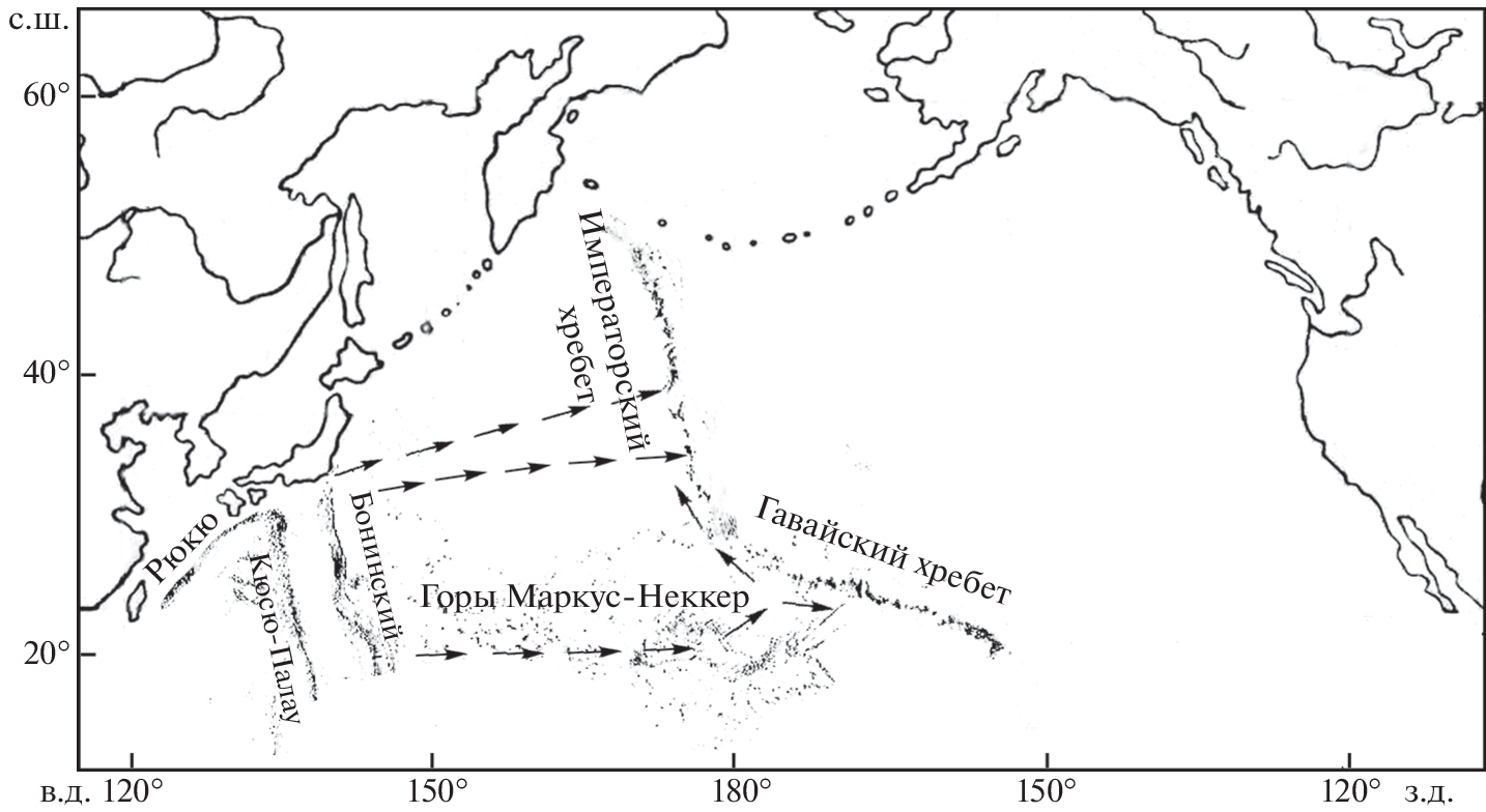 The presented data on distribution of cartilaginous fishes in the northern Pacific Ocean show that the core of the fauna of the Emperor Seamount Chain includes Indo-West Pacific species that inhabited the ridge from the coast of Asia. Epipelagic species are not permanent residents of the region, but annually migrate from the mainland to the ocean together with common abundant fish species that form their food supply. Sharks and chimaeras of the meso-benthopelagic zone constitute the basis of permanent cartilaginous fish communities of the seamounts of the Northwestern Pacific. Representatives of the lower meso-benthopelagic zone populated the Hawaiian and Emperor Seamount Chains along with the Markus-Necker Ridge. Less deep-sea, but adapted to a fairly long-term dwelling in the water column in the adult state, the species of the upper meso-benthopelagic zone, spreading towards the ridge, covered a distance of about 3000 km in the pelagic zone. Probably, some sharks of the lower meso-benthopelagic zone could inhabit the underwater mountains of the Emperor Seamount Chain in the same way. The low endemicity of cartilaginous fishes in the considered area (5%) and the presence of identical and closely related species in southern Japan do not allow us to regard migrations to the Emperor ridge as rare, with the exception of sharks of the genera Squalus and Centroscyllium, which diverged on the seamounts to the level of new species.