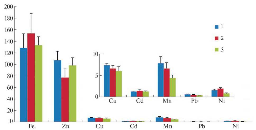 Рис. 3. Средние концентрации металлов (мкг/г сух. массы) в мягких тканях целиком (n = 5): 1 – Mytilus trossulus, 2 – M. galloprovincialis, 3 – гибридные формы.