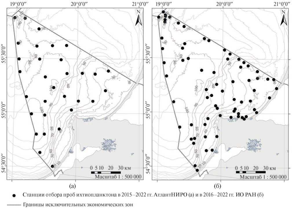Сбор ихтиопланктонных проб производили в границах исключительной экономической зоны РФ (далее ИЭЗ) с марта 2015 по июль 2022 г. на судах ИО РАН (“Профессор Штокман”, “Академик Иоффе”, “Академик Борис Петров”, “Академик Николай Страхов”, “Академик Сергей Вавилов”) и на судах АтлантНИРО (СТМ “Атлантида” и СТМ “АтлантНИРО”). Количество ихтиопланктонных проб, собранных за весенне-летний сезон на судах ИО РАН за указанные годы, составило 281, на судах АтлантНИРО – 131, в сумме – 412 проб. В качестве орудия лова использовали сеть ИКС-80. Сбор проб проводили по стандартной методике (Расс, Казанова, 1966) посредством вертикального облова слоя дно-поверхность. Пробы фиксировали 4%-м раствором формальдегида. Местоположение ихтиопланктонных станций в сборах АтлантНИРО и ИО РАН в пределах Гданьской впадины показано на рис. 1.