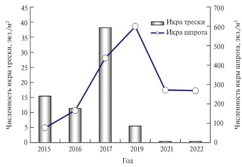 Межгодовая динамика численности икры трески характеризовалась пиком численности в 2017 г. и ее резким снижением в 2021–2022 гг. (рис. 2).