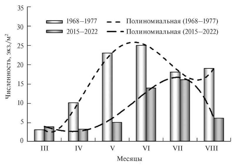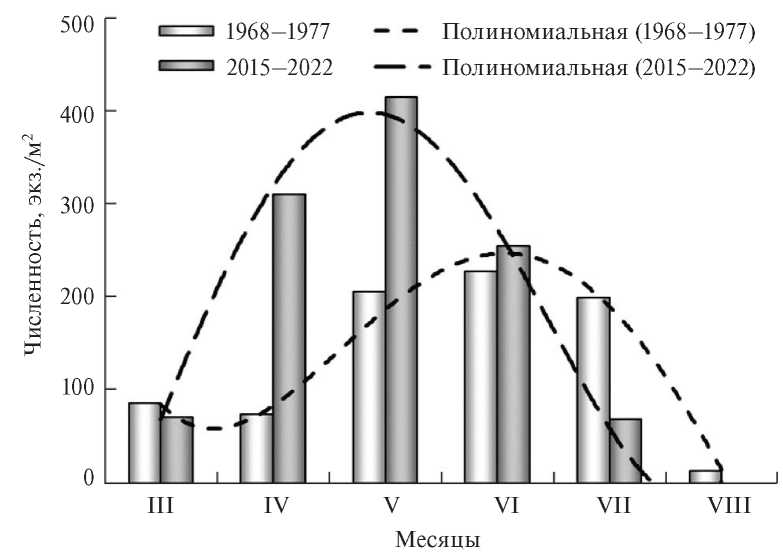 Напротив, пик максимальной численности икры шпрота сдвинулся на более ранние сроки: c мая–июля 1968–1977 гг. на апрель–май 2015–2022 гг. (рис. 4).