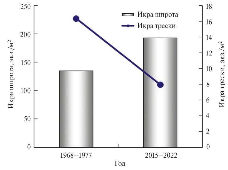 Рис. 5. Средняя численность икры шпрота и трески (экз./м2) в Гданьской впадине в 1968–1977 и 2015–2022 гг.