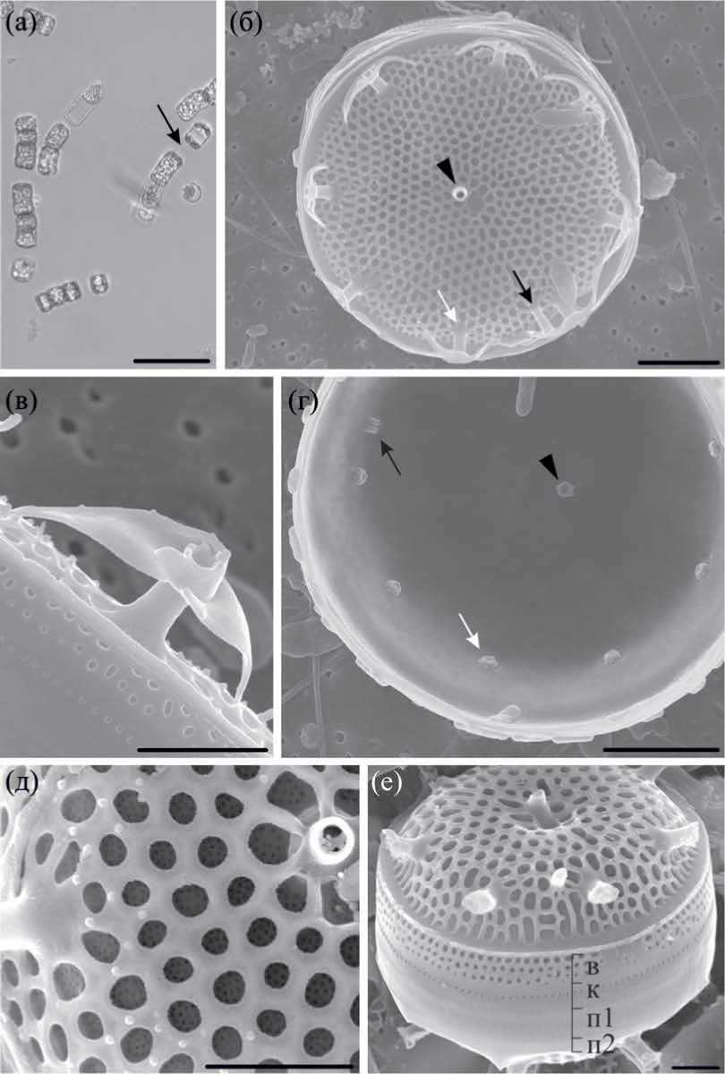 Рис. 1. Thalassiosira tealata. a – клетки объединены в цепочки (стрелкой указан тяж); б – общий вид створки (короткой стрелкой указан центральный вырост с опорами, белой стрелкой указан краевой вырост с опорами, черной стрелкой – двугубый вырост); в – краевой вырост с опорами; г – внутренняя часть створки (короткой стрелкой указан центральный вырост с опорами, окруженный тремя сателлитными порами; белой стрелкой указан краевой вырост с опорами, окруженный четырьмя сателлитными порами; черной стрелкой – двугубый вырост); д – часть створки, показывающая крибрум; е – поясковая зона, в – вальвокопула, к – копула, П1 и П2 – плевры; а – СМ, б–е – СЭМ. Масштаб: а – 20 мкм, б, в, д, е – 1 мкм, г – 2 мкм.