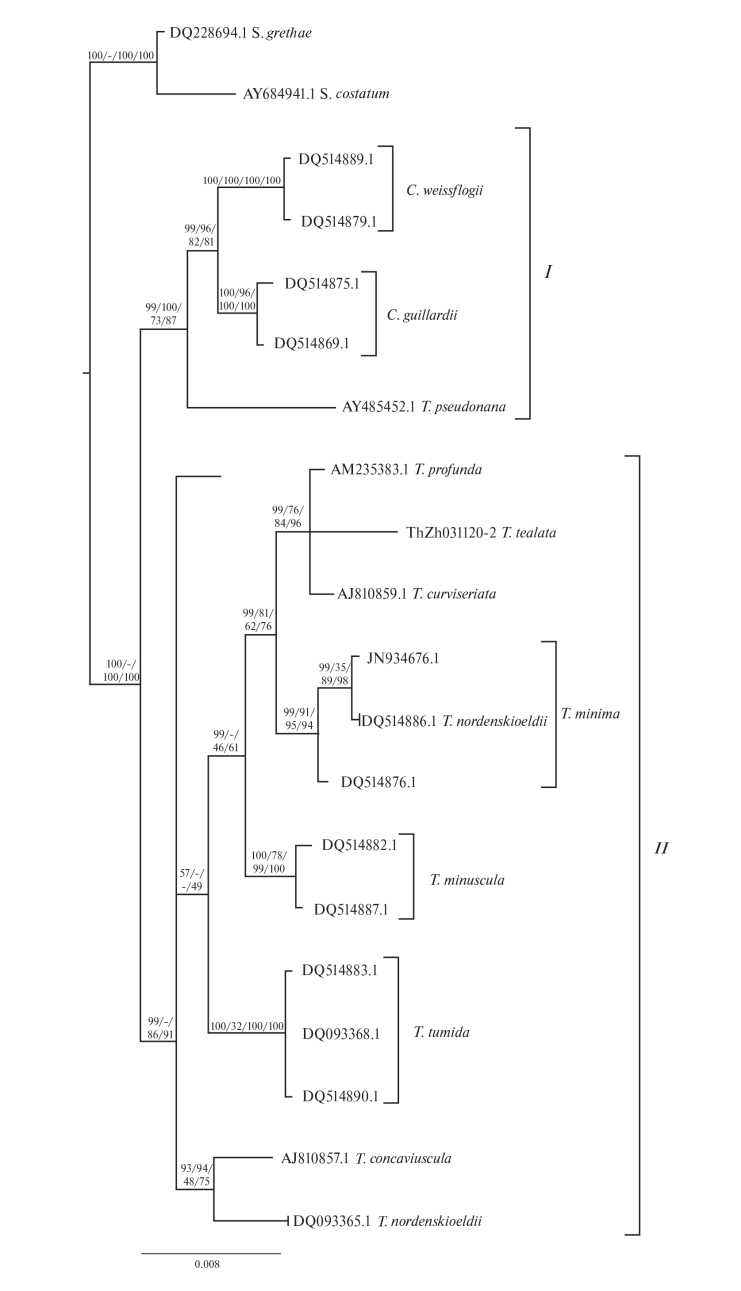 Во второй филогруппе (рис. 2) в базальном положении находится группа из последовательностей AJ810857.1 T. concaviuscula Makarova, 1978 и DQ093365.1 T. nordenskioeldii Cleve, 1873 (поддержка по методу MP менее 50%), при этом другая последовательность DQ514886.1 T. nordenskioeldii располагается в монофилетической кладе вида T. minima Gaarder, 1951 (поддержка по методу NJ менее 50%). Таким образом, последовательности T. nordenskioeldii не формируют общую кладу, из-за чего у данного вида на нашем филогенетическом дереве прослеживается парафилия. Виды T. tumida (Janisch) Hasle, 1971 и T. minuscula Krasske, 1941 формируют отдельные монофилетические клады, в основном, с высокими поддержками (поддержка T. tumida по методу NJ менее 50%). Полученная в настоящем исследовании последовательность T. tealata находится в хорошо поддержанной группе с видами T. profunda (Hendey) Hasle, 1973 и T. curviseriata Takano, 1983. Ветви видов в данной группе формируются из одного узла, что является политомией.