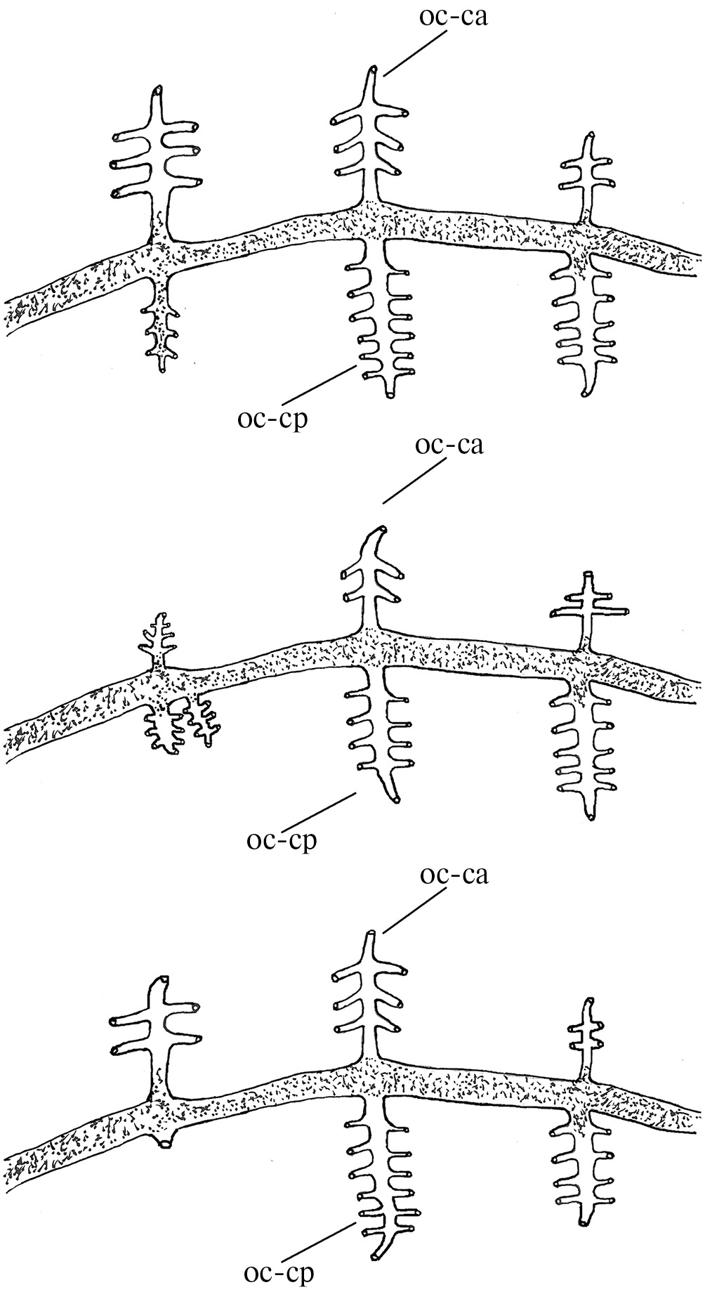 Рис. 3. Изменчивость строения затылочной комиссуры Bovichtus variegatus. Центральные канальцы: oc-ca – передний, oc-cp – задний