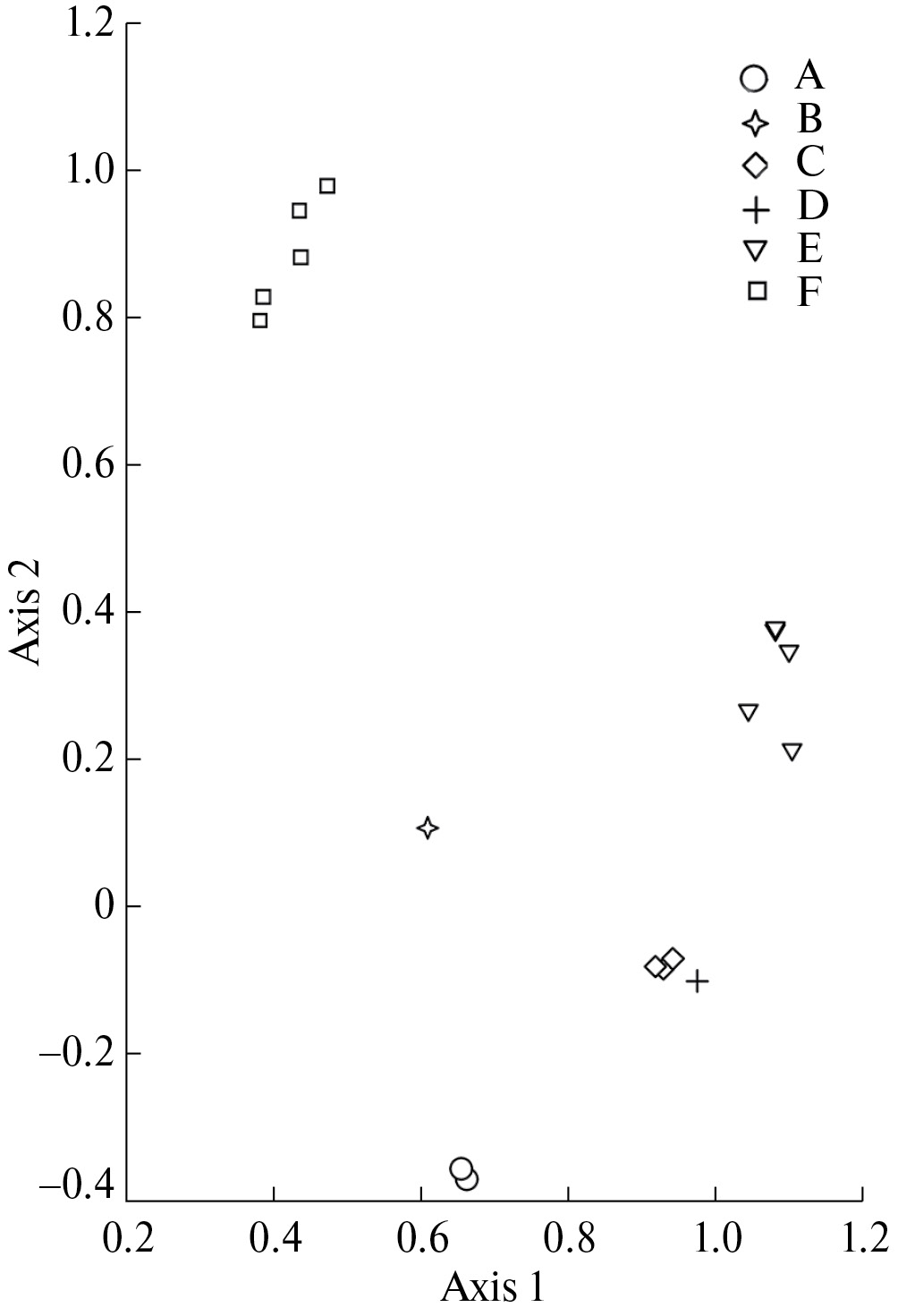 Рис. 2. Ординационный анализ высшей водной растительности песчано-илистой сублиторали Черного и Азовского морей: A – Zostero marinae–Pneophylletum fragile, B – Nanozostero noltii–Pneophylletum fragile subass. typicum, C – Nanozostero noltii–Pneophylletum fragile subass. zosteretosum marinae var. typicum, D – Nanozostero noltii–Pneophylletum fragile subass. zosteretosum marinae var. Ruppia maritima, E – Nanozostero noltii–Pneophylletum fragile subass. zosteretosum marinae var. Сhondria capillaris, F – Nanozostero noltii–Ceramietum deslongchampsii