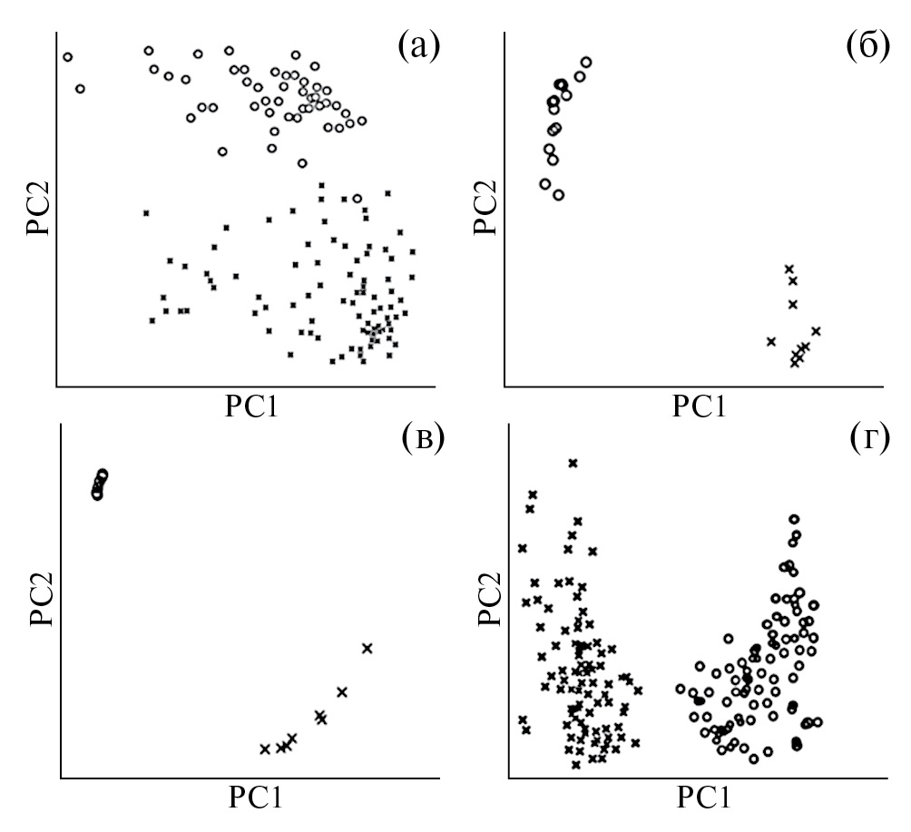 Традиционный для классической систематики дифференциальный диагноз этих видов тихоокеанских лососей по отдельным морфологическим признакам, как, впрочем, и по молекулярно-генетическим маркерам, по нашему мнению, в настоящее время невозможен. Однако мы считаем, что при оценке видового таксономического статуса гораздо важнее сравнивать масштабы многомерных различий по какой-то группе признаков (морфологических или молекулярно-генетических) между потенциальными видами и их внутривидовыми группировками (популяциями, локальными стадами и сезонными расами). Рассматривая с этой позиции наши результаты по генетике (в частности, рис. 3, на котором представлены диаграммы главных компонент, основанные на матрицах генетических дистанций между различными выборками), мы видим, что линии горбуши четных и нечетных лет нереста образуют отдельные, хорошо разграниченные кластеры, тогда как группировки внутри этих кластеров не показывают рельефных границ.