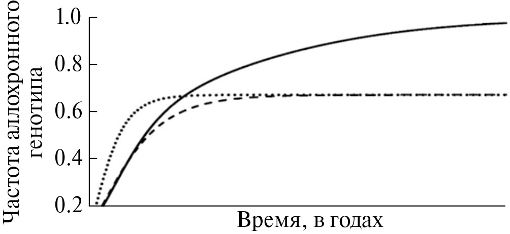 Рис. 4. Динамика частот особей аллохронного генотипа А2А2 в популяции при отборе против гетерохронных генотипов. Условные обозначения: жирная линия: отбор против всех гетерохронных особей с интенсивностями s13 = 0.01, s12 = 0.001 и s23 = 0.001; штриховая и пунктирная линии: отбор только против крайне гетерохронных особей А1А3 с интенсивностями s13 = 0.01 и 0.02, соответственно. Длительность моделирования – 10 тыс. лет