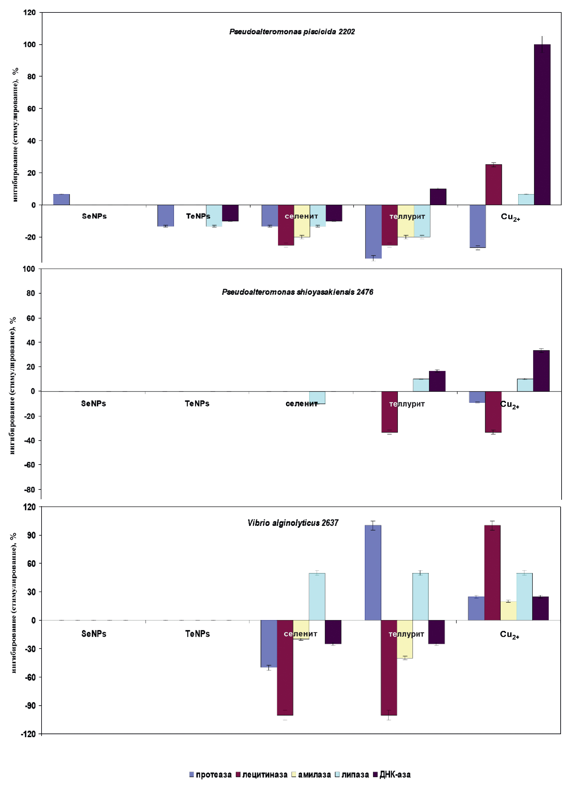 Анализ активности протеазы показал ее количественные колебания в зависимости от вида бактерий и токсического агента (табл. 1). Так, добавка наночастиц селена и теллура приводила к ингибированию синтеза протеазы, за исключением P. piscicida 2202 и P. shioyasakiensis 2476. У стафилококка под воздействием наночастиц теллура наблюдалось стимулирование протеазы. Ионы меди оказывали стимулирующее действие на большинство протестированных штаммов.