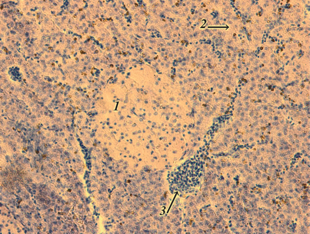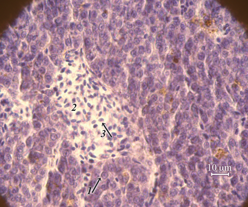 Рис. 3. Гепатоцеллюлярная аденома на фоне лейкоцитарной инфильтрации в печени обыкновенной кильки Clupeonella caspia. Ув. ×400. 1 – отдельный участок опухоли, 2 – отек паренхимы печени, 3 – вена