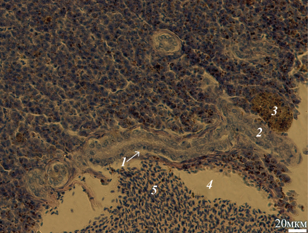 Рис. 2. Суженный просвет желчного протока в печени обыкновенной кильки Clupeonella caspia. Ув. ×400. 1 – отрыв базальной мембраны от кубических эпителиоцитов, 2 – сужение просвета желчного протока, 3 – крупная гранула гемосидерина, 4 – междольковая вена, 5 – форменные элементы крови