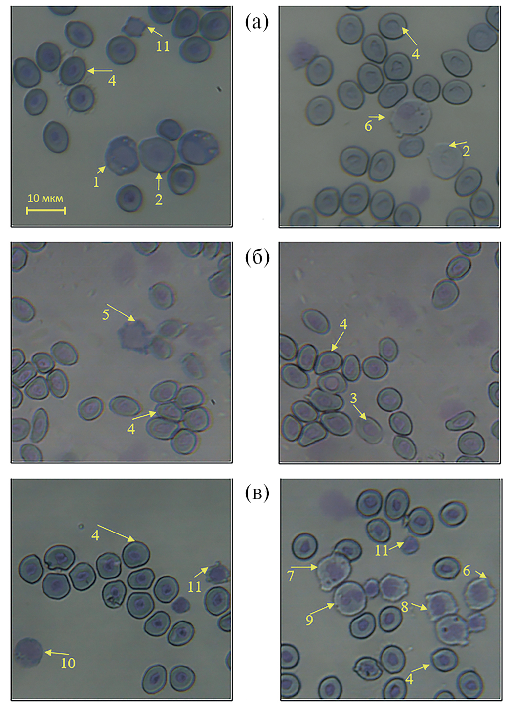 Рис. 1. Клетки крови минтая Gadus chalcogrammus (а), наваги Eleginus gracilis (б) и трески Gadus macrocephalus (в). Масштаб: 10 мкм. Условные обозначения: 1 – эритробласты, 2 – нормобласты, 3 – базофильные эритроциты, 4 – зрелые и полихроматофильные эритроциты, 5 – миелобласты, 6 – миелоциты, 7 – метамиелоциты, 8 – палочкоядерные нейтрофилы, 9 – сегментоядерные нейтрофилы, 10 – моноциты и 11 – лимфоциты.