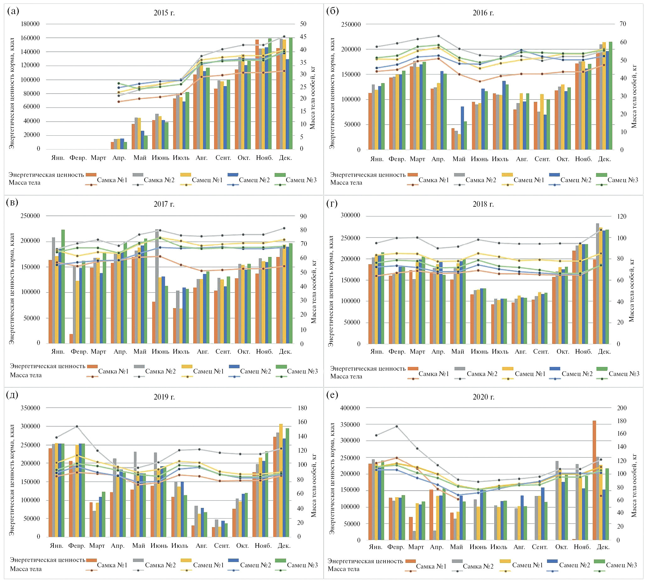 Повышение количества потребляемого корма самкой № 2 в апреле 2019 г. вызвано длительным голоданием животного в марте: 6 марта она принесла потомство и в период вскармливания детеныша воздерживалась от пищи. Самка потеряла 20 кг массы тела во время родов и еще 45 кг за 3 недели вскармливания. У остальных особей весовые показатели за этот год были относительно стабильными и соответствовали сезонным циклам (рис. 1д, 2д).