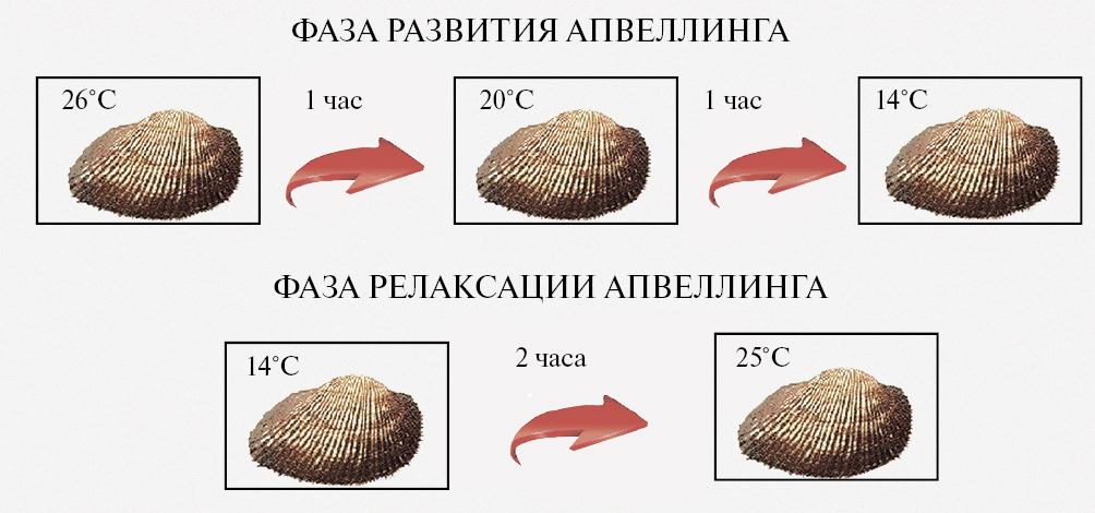 Рис. 1. Схема проведения эксперимента с изменением температуры морской воды в соответствии с последовательными фазами апвеллинга.