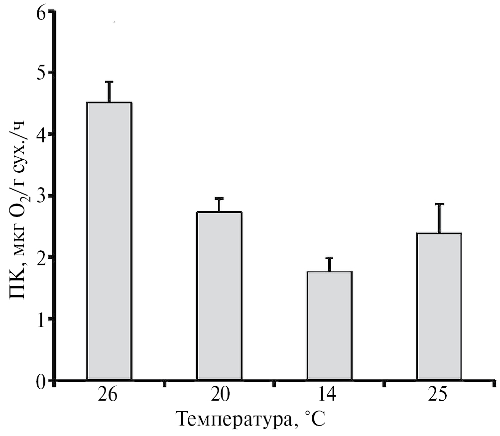 При последующем возвращении условий к первоначальным значениям температуры (14→25°С) скорость дыхания A. kagoshimensis увеличивалась, коэффициент Q10 = 1.31.